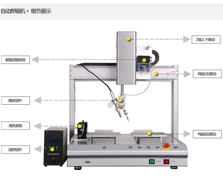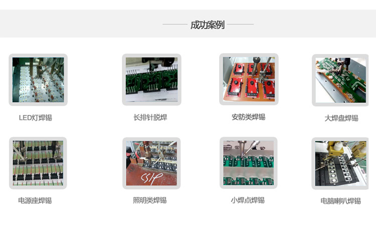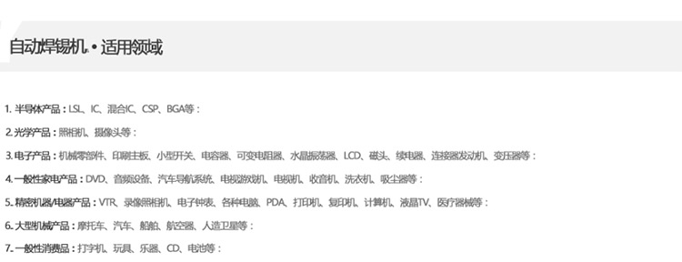 主动焊锡机首要利用于电子制作业,首要针对回流焊、波峰焊等出产装备很难到达的工艺制程和焊锡加工,出格合用于混装电路板、热敏感元器件、SMT后端工序中敏感器件的焊接,普遍利用于PCB焊线、充电器插头焊接、毗连器焊接、DC端子加锡、LED灯带毗连等范畴。主动焊锡机器人取代野生焊接,进步任务效力,改良焊接品质。